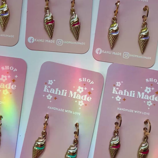 These fun and lightweight huggie hoops feature cute ice cream cone charms, perfect for adding a touch of summer to any outfit.