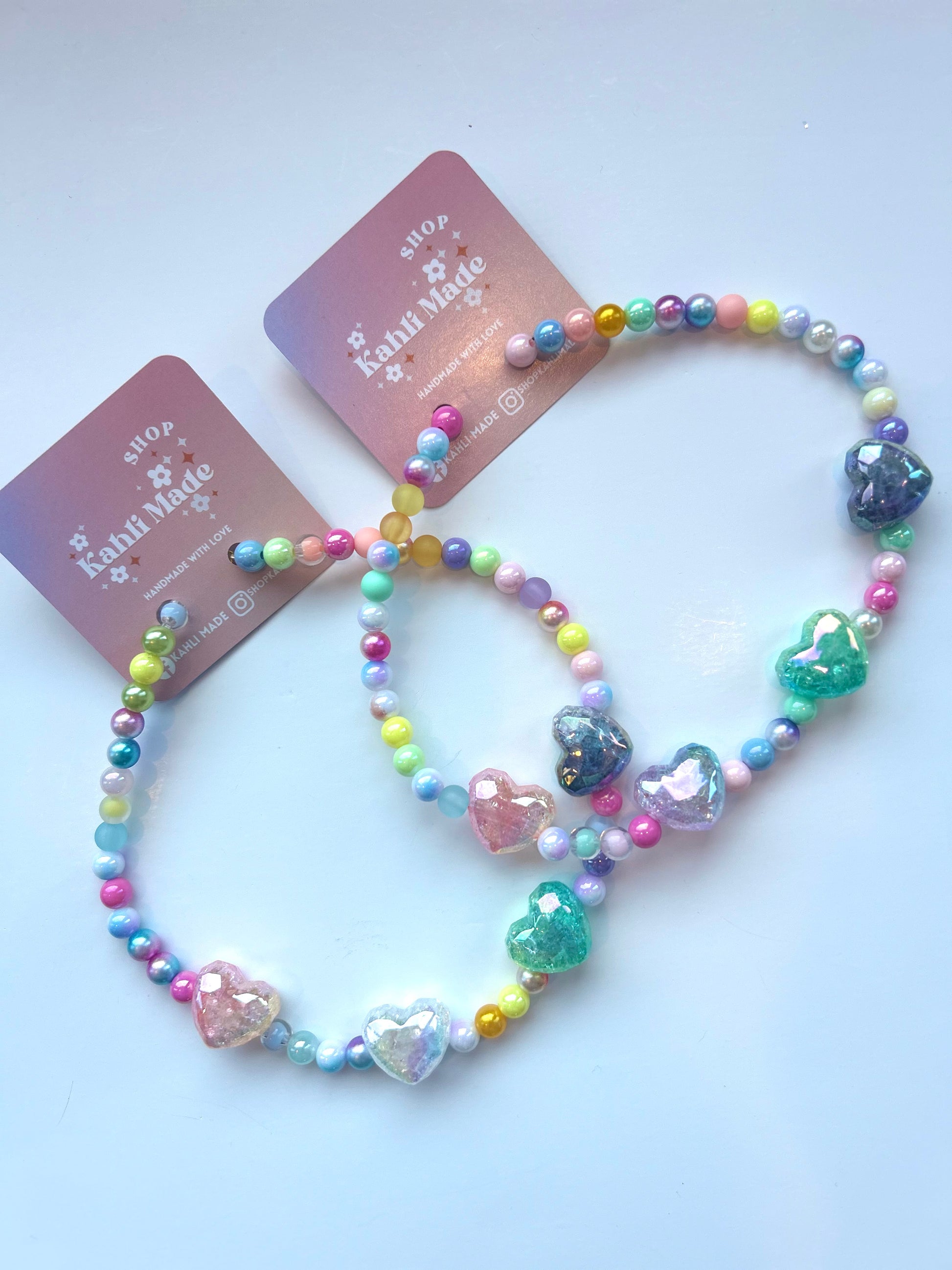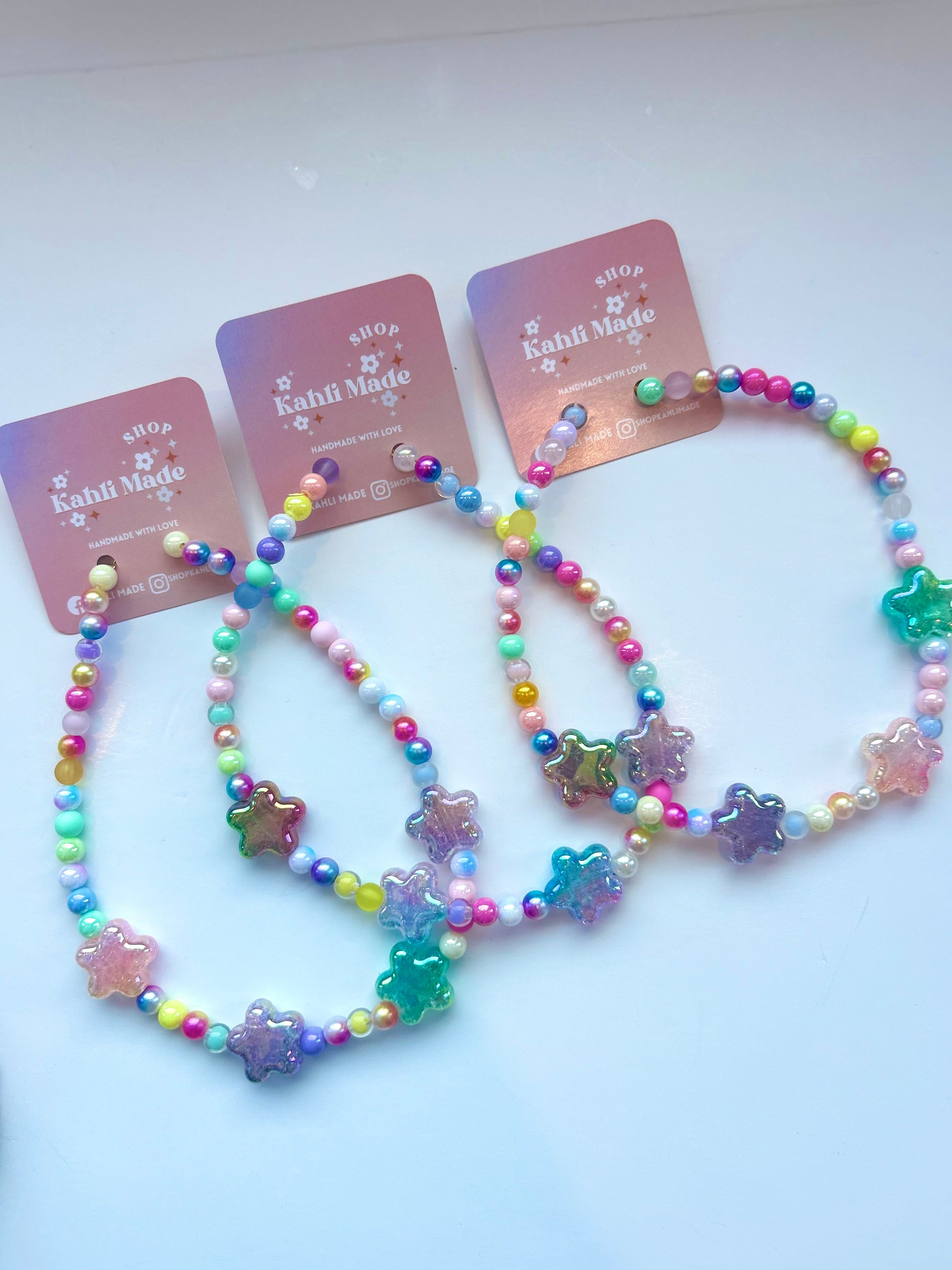 Featuring an iridescent heart pendant paired with delicate star charms, this piece brings the perfect mix of magical, girly sparkle. Lightweight, comfortable, and endlessly fun, it’s the ultimate accessory for kids who love a little everyday enchantment.