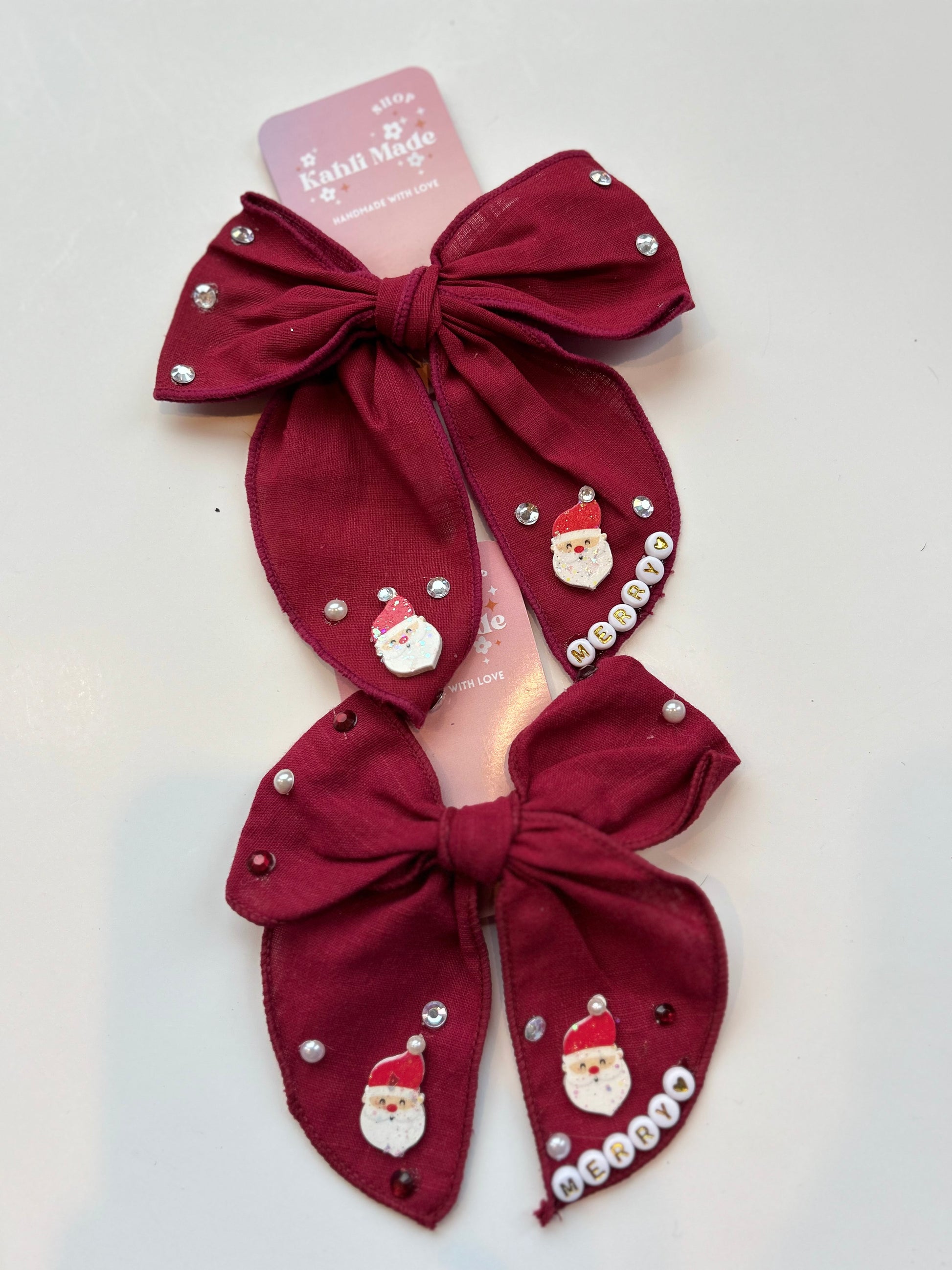 Add the sweetest touch of Christmas magic to any look with our Holiday Bows — festive, girly, and full of shimmer. Each bow is hand-embellished with Kahli Made sparkle, making it the perfect accessory for holiday photos, parties, gift-giving, or everyday merry moments.